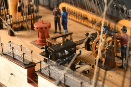 Step onto the quarter deck of HMS Surprise, where a partial view reveals the sturdy steering wheels and a carronade, alongside a young boy proudly showcasing the wooden hull of a model to an officer.