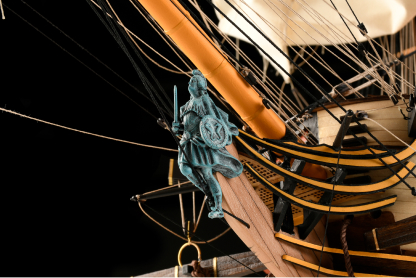 Capture the bold elegance of HMS Surprise’s prow, featuring its intricately carved figurehead, a portion of the sturdy anchor, and the forward-reaching bowsprit. This view embodies the ship’s adventurous spirit and meticulous craftsmanship.