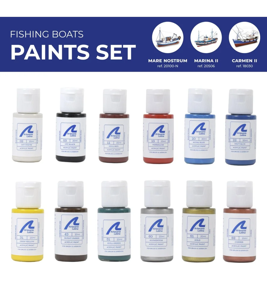 Modellfärgerna för fiskebåtar kan användas för att måla skalmodeller av Artesanía Latina del Carmen, Marina II och många andra. De passar perfekt för airbrush, men kan också användas med pensel.