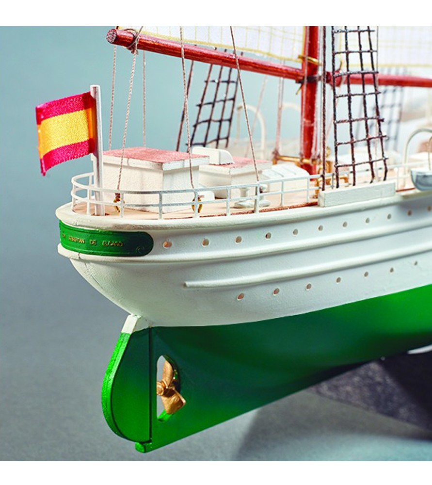 Oplev Juan Sebastian Elcano lavet af Artesania Latina , træ- og plastmodellen af denne repræsentative spanske skonnertbrig-sejlbåd. Den er opkaldt efter den spanske opdagelsesrejsende Juan Sebastian Elcano, som var kaptajn på den ekspedition - efter Fernando de Magallanes' død - der gennemførte den første jordomsejling i 1522.
