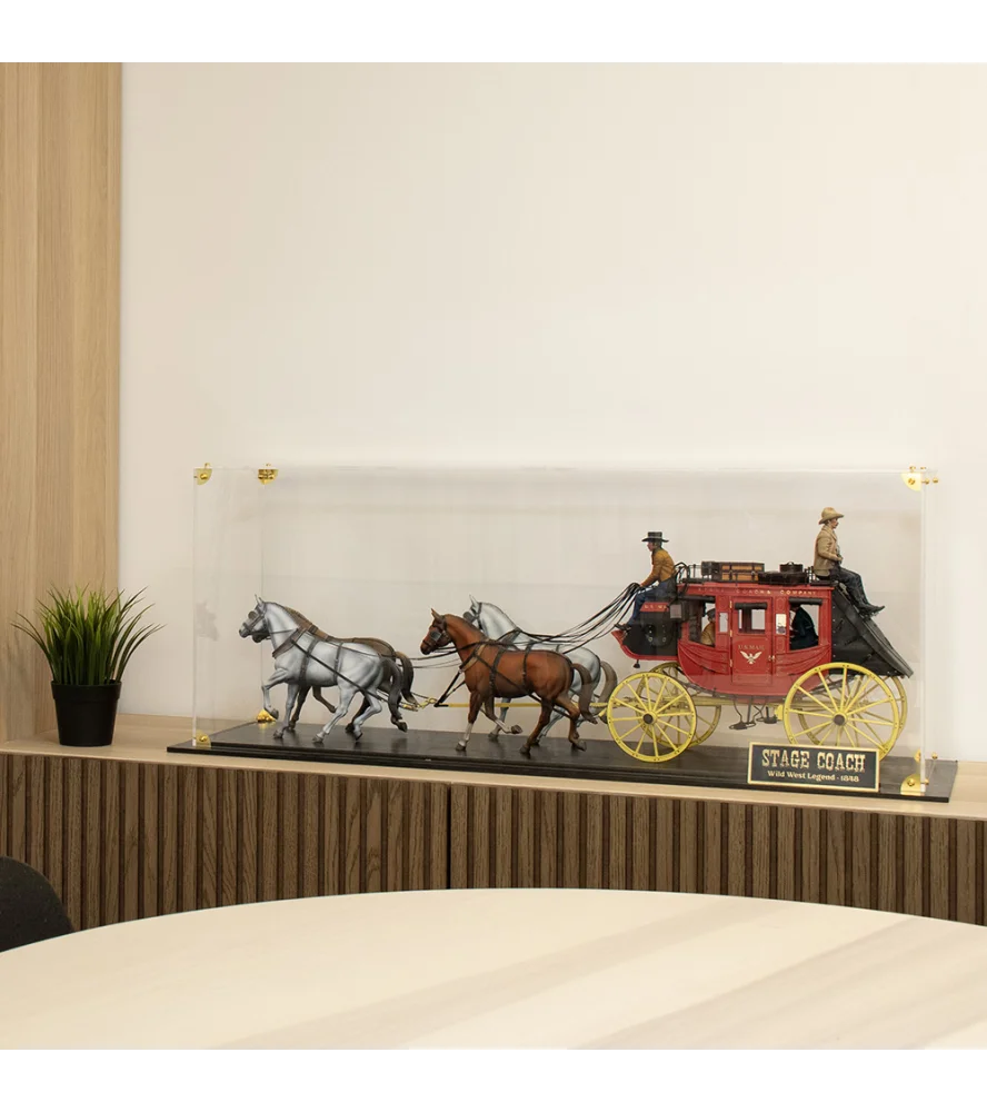 - Vitrina acrílica (Artículo 20345-AS): Una vitrina a medida fabricada en acrílico coreano de primera calidad, con base de madera, placa de identificación de latón macizo y esquineras de latón, diseñada para el Stage Coach con 4 caballos (357 x 280 x 902 mm o 14 1/16" x 11" x 35 1/2").