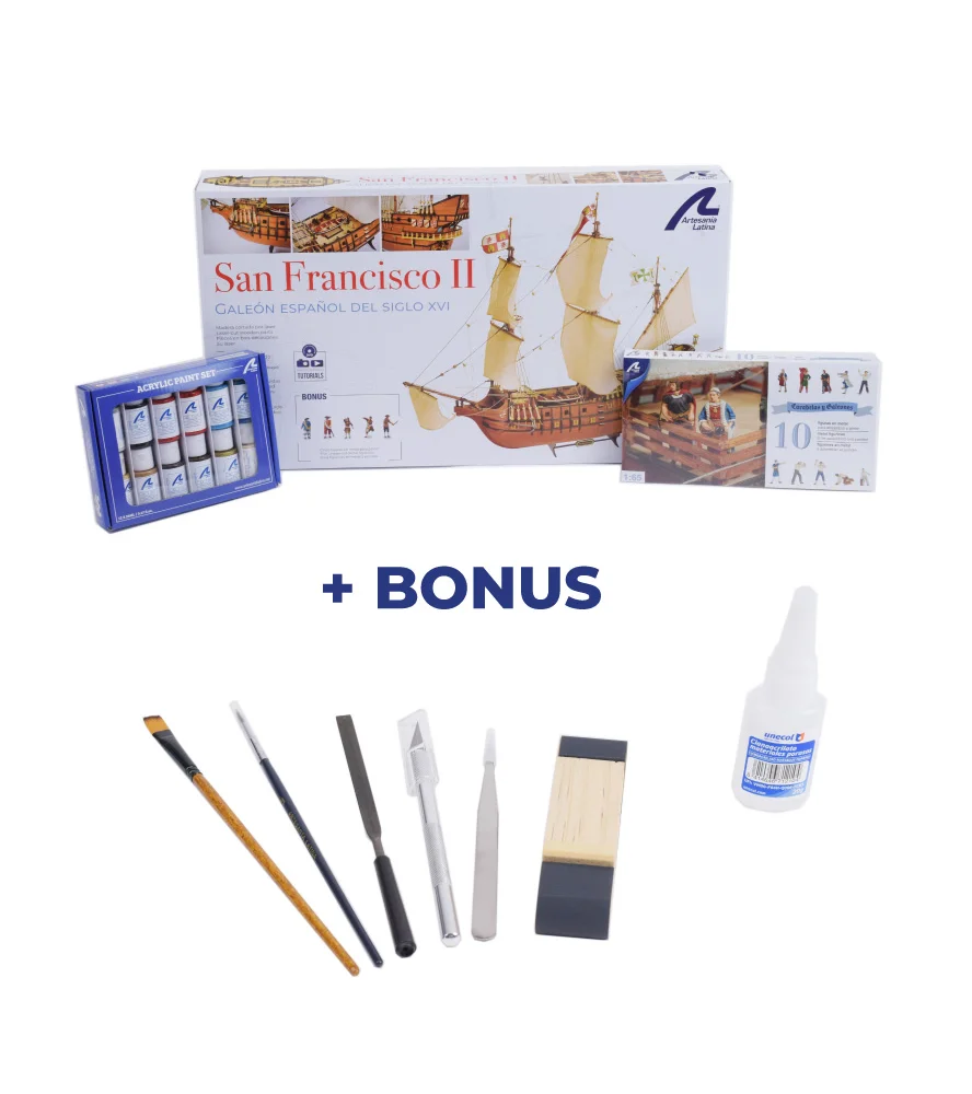 Artesanía Latina sa che ci sono molti parenti e amici di modellisti che, in numerose occasioni, desiderano regalare loro un kit di modelli della nostra azienda. Il problema sorge quando non conoscono bene questo meraviglioso hobby e non sanno quali sono i prodotti che devono essere aggiunti per aiutare nella costruzione del modello. Per questo motivo, sono ora disponibili i nuovi Pacchetti regalo, che comprendono sia il modello in scala scelto che le vernici (finiture) e gli attrezzi. E a un prezzo più conveniente rispetto a quello che si otterrebbe acquistando tutto separatamente, dato che gli attrezzi... Li regaliamo! Questo è il caso della confezione regalo del modello in legno del galeone spagnolo San Francisco II (22452L).