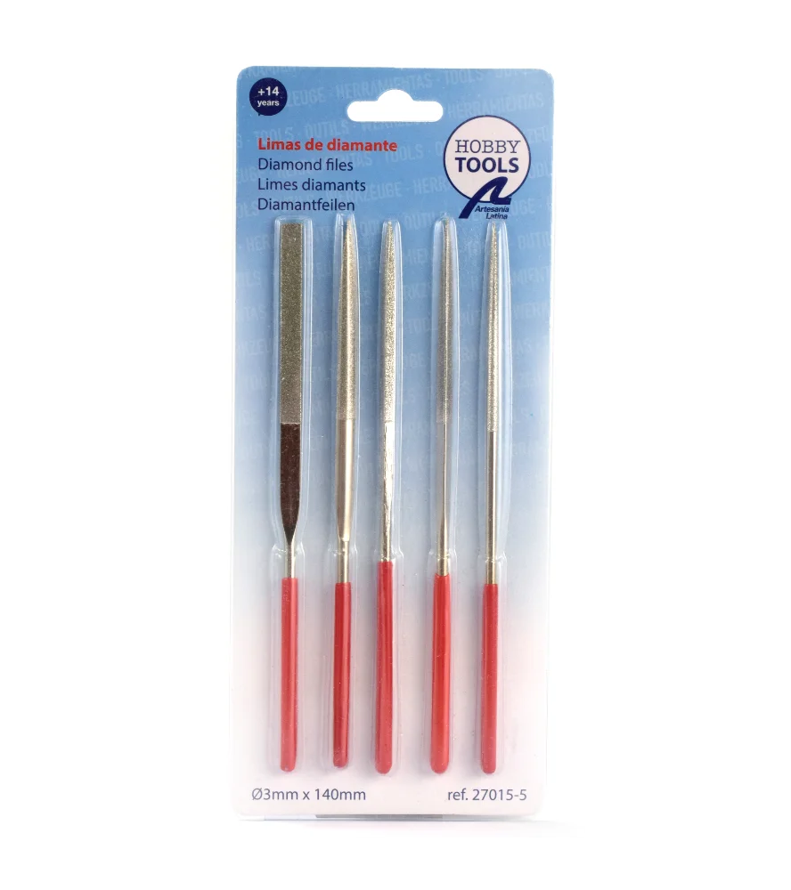 På denne måde har Artesanía Latina i sin samling af kvalitetsmodelleringsværktøjer Hobby Tools skabt et sæt med 5 diamantfiler med flad, halv stok, musehale, trekantet og firkantet form, så elskeren af modellering kan arbejde med de mest minimale detaljer med maksimal præcision, fordi filerne for eksempel har skridsikkert håndtag.