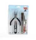 Grundlæggende sæt med modelværktøj, sæt nr. 3. Det tredje grundlæggende modelværktøjssæt indeholder de værktøjer, du skal bruge for at bygge dine modelskibe, -fly og -tog lettere: Det indeholder en saks med gevindskærer,en lineal i rustfrit stål, et lille håndbor, en fil og en tang med rund næse.