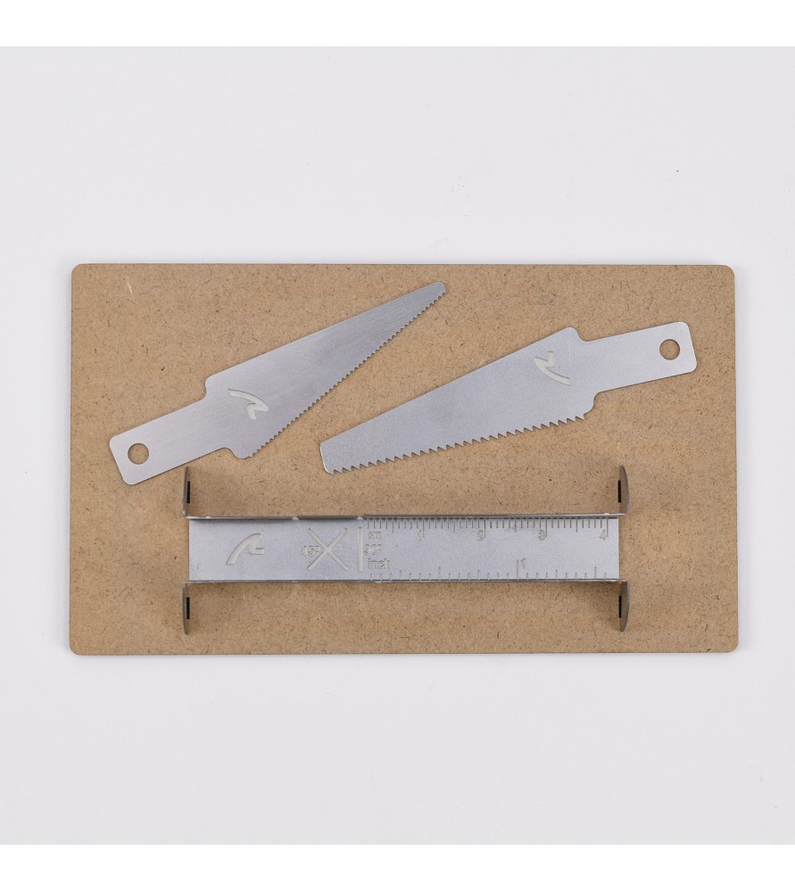 Sie enthält vier unentbehrliche Modellierwerkzeuge: die Gehrung, die fein gezahnte Säge -für Kunststoffe-, die grob gezahnte Säge -perfekt für Holz- und die DM-Basis, die ideal ist, um den Bereich zu schützen, in dem die Schnitte mit der Micro Gehrungsbox mit Sägen, auch Micro Gehrungsbox genannt, ausgeführt werden.