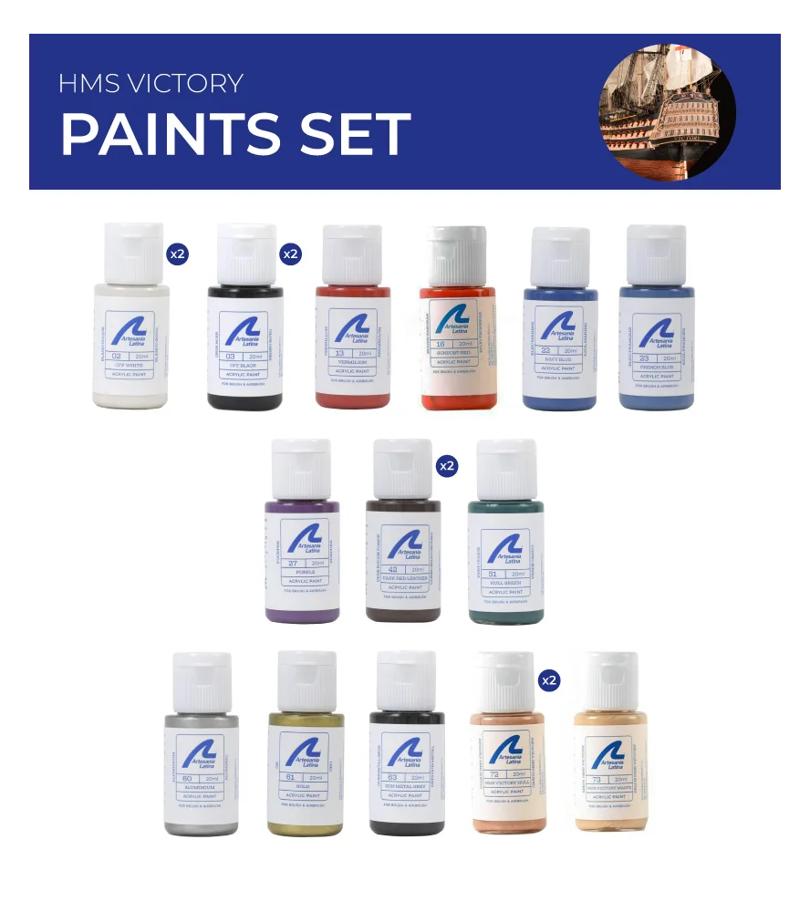 Das Artesanía Latina Farbpaket auf Wasserbasis für die Modellschiffe der Royal Navy (HMS Victory und andere) ist das ideale Produkt für eine perfekte und originalgetreue Ausführung dieser Miniaturnachbildungen.Fügen Sie es Ihrer Modellbauwerkstatt hinzu, um dieses und viele andere Modelle im Maßstab 1:84 zum Glänzen zu bringen, sobald sie gebaut sind! Die Farbpackung auf Wasserbasis für Modellschiffe der britischen Royal Navy wie die HMS Victory hat einen reduzierten Preis im Vergleich zum Einzelkauf der Farben!