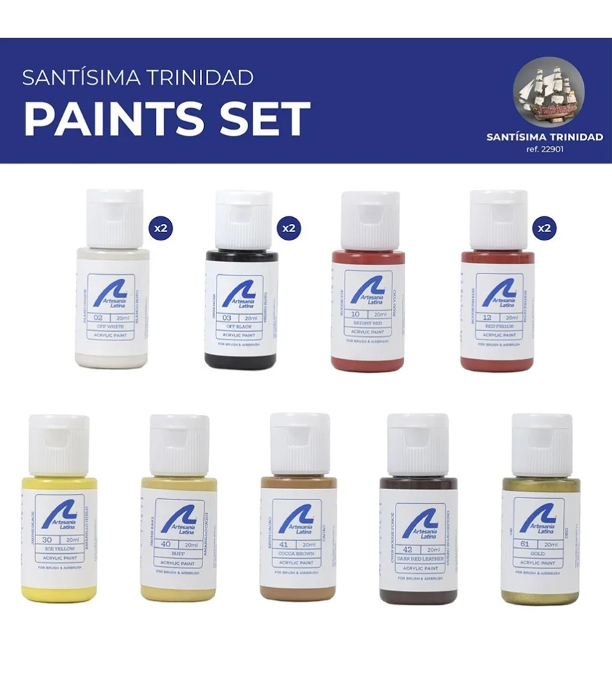 Das Farbset auf Wasserbasis von Artesania Latina für das Schiffsmodell der Linie Santísima Trinidad ist das ideale Produkt, damit die Oberflächen dieser Miniaturnachbildungen perfekt und originalgetreu sind. Holen Sie es in Ihre Modellbauwerkstatt, um diese und viele andere Schiffsmodelle nach dem Bau zum Strahlen zu bringen. Das Set mit Farben auf Wasserbasis und Acrylfarben für Modelle der Santísima Trinidad ist günstiger als der Einzelkauf der Farben!