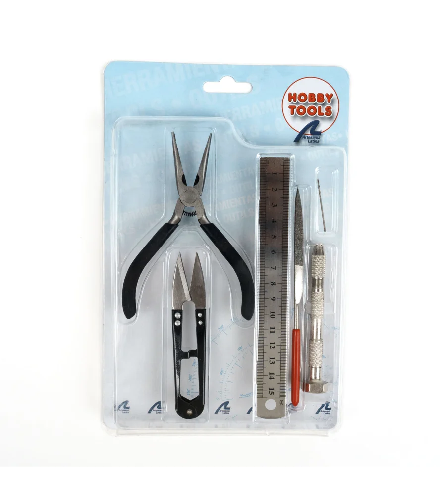 Grundausstattung an Modellierwerkzeuge Satz Nr. 3. Der dritte Grundbausatz für Modellierwerkzeuge enthält die Werkzeuge, die Sie benötigen, um Ihre Schiffsmodelle, Flugzeuge und Züge einfacher zu bauen: Es umfasst Fadenschneider, Schere, Lineal aus rostfreiem Stahl, kleine Handbohrmaschine, Feile y Rundzange.