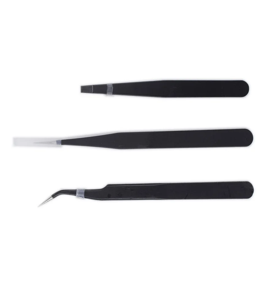 Set mit 3 professionellen ultrafeinen Pinzetten - gerade, gebogen und flach - Präzision aus nichtmagnetischem Edelstahl, der verhindert, dass kleine Metallteile Ihrer Modelle an der Spitze haften bleiben und somit die korrekte Platzierung verhindern. Mit diesen Pinzetten haben Sie dieses Problem nicht!