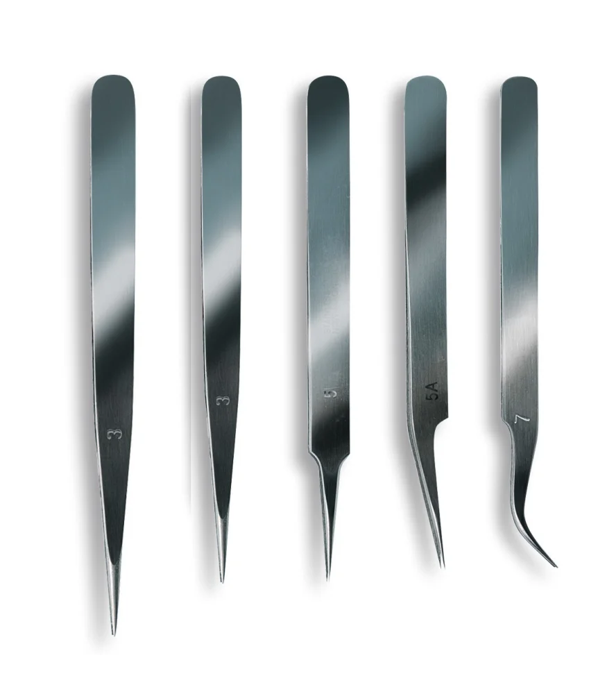 Professional precision straight tweezers with fine tip made of stainless steel. Put the little parts you want on its proper placement. With our tweezers you will get access to the deepest corners! The set includes 4 straight tweezers of different length and termination and a curved tweezers for precision works on model building. The perfect tools for your modeling toolbox.