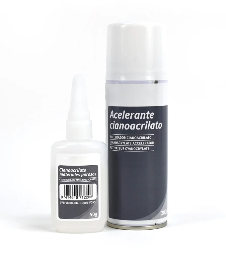 Hence, it is absolutely necessary for the dense cyanoacrylate to be presented together with the cyano accelerator spray (200 milliliters) to make the glue dry more quickly. They are basic modeling tools and crafts to be able to glue any type of piece or object with perfect fixation.