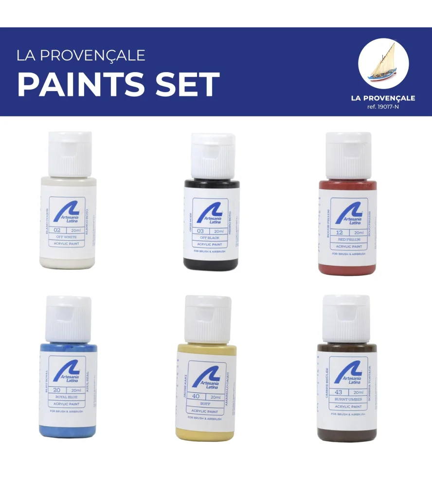 The water-based paints set for French fishing boat La Provençale consists of 6 jars of different paints, each one with 20 ml of product. In this sense, it includes the following colors in paints: Off-White, Off-Black, Buff, Burnt Umber, Royal Blue and Red FS11136.