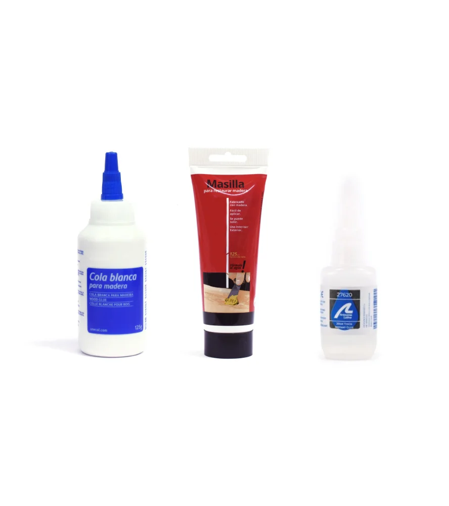 The pack of adhesives and putty for small ship models, among other scale models, consists of 3 different pots with products such as white glue 125 gr, cyanoacrylate for porous materials 20 gr and, finally, water-based putty for treating wood 125 gr.