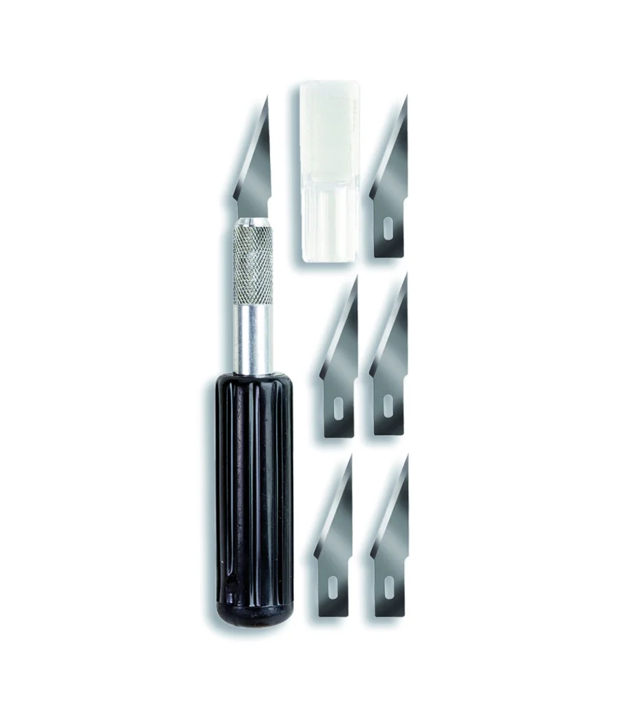 Cúter Nº5 con mango ergonómico y cinco cuchillas para tareas relacionadas con cortar piezas de maquetas u otros objetos de tamaño reducido. Esta herramienta de modelismo u otras manualidades como los trabajos con papel, cartón, plástico y electricidad sirve para lo siguiente: facilita el corte con una absoluta precisión y comodidad. Fabricado en metal de alta calidad y plástico reforzado para su durabilidad, el cúter incluye una tapa protectora para evitar cortes cuando no está en uso.