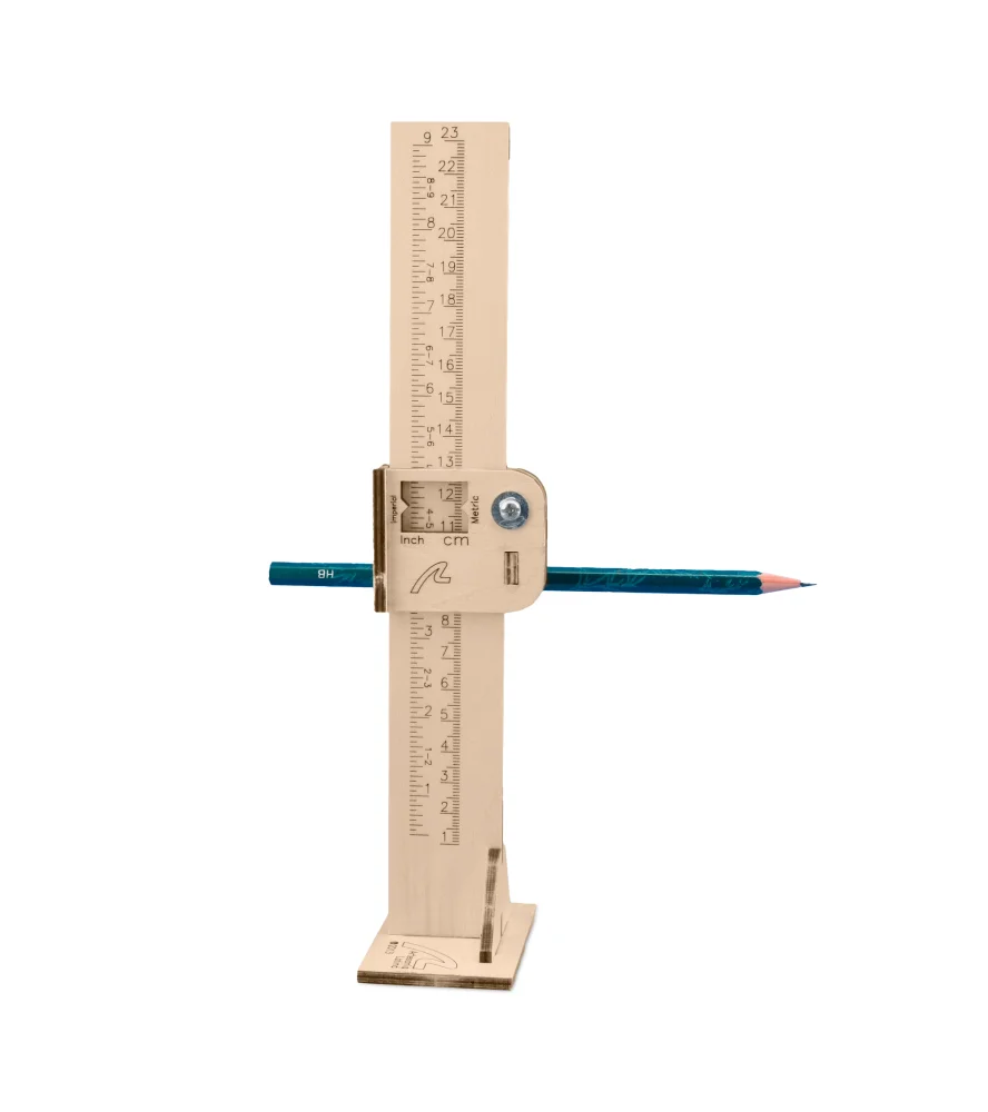 Es ajustable en altura e incluye medidas tanto en sistema métrico como en imperial -hasta 23 cms o 9 pulgadas-. Está fabricado con piezas de madera contrachapada cortada por láser para su óptimo montaje -requiere su construcción- y sujeta el lápiz con una pequeña cuña.