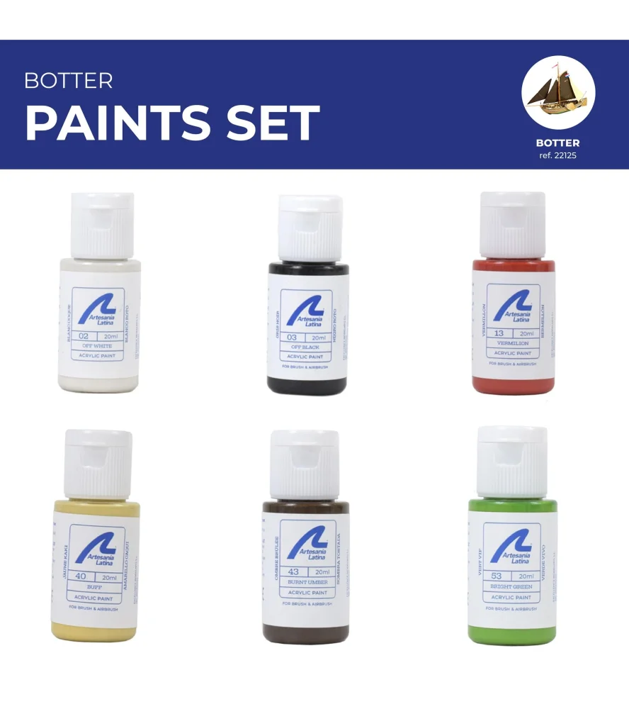 Las pinturas acrílicas, como estas al agua de Artesanía Latina, son las más usadas por el modelista experto, puesto que resultan las más indicadas para su aplicación mediante aerógrafo. El pack de pinturas al agua para el barco de pesca holandés Botter tiene una base de agua y son acrílicas. ¡Indispensable en su taller de modelista!