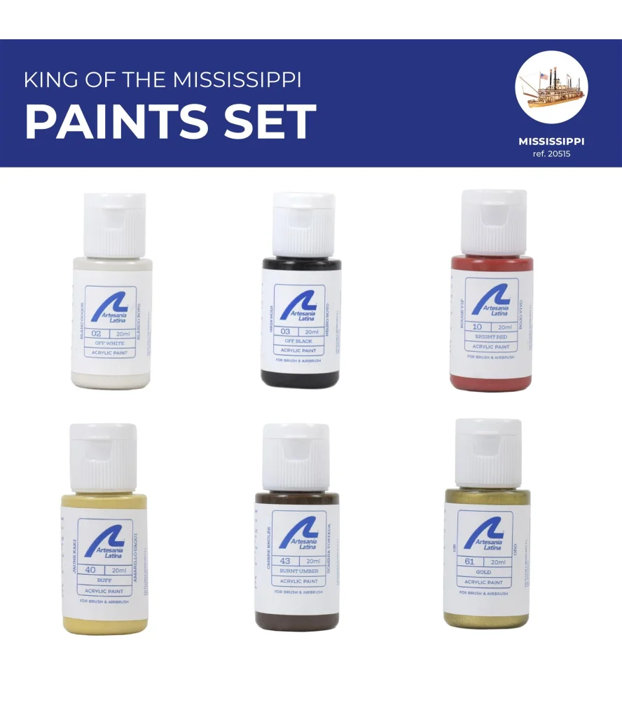 Ensemble de peintures pour maquette bateau à vapeur King of the Mississippi peut être utilisé pour peindre cette modèle réduit 1/80 d'Artesanía Latina. Ils sont parfaitement adaptés à une utilisation avec un aérographe, bien qu'ils puissent également être utilisés avec un pinceau.