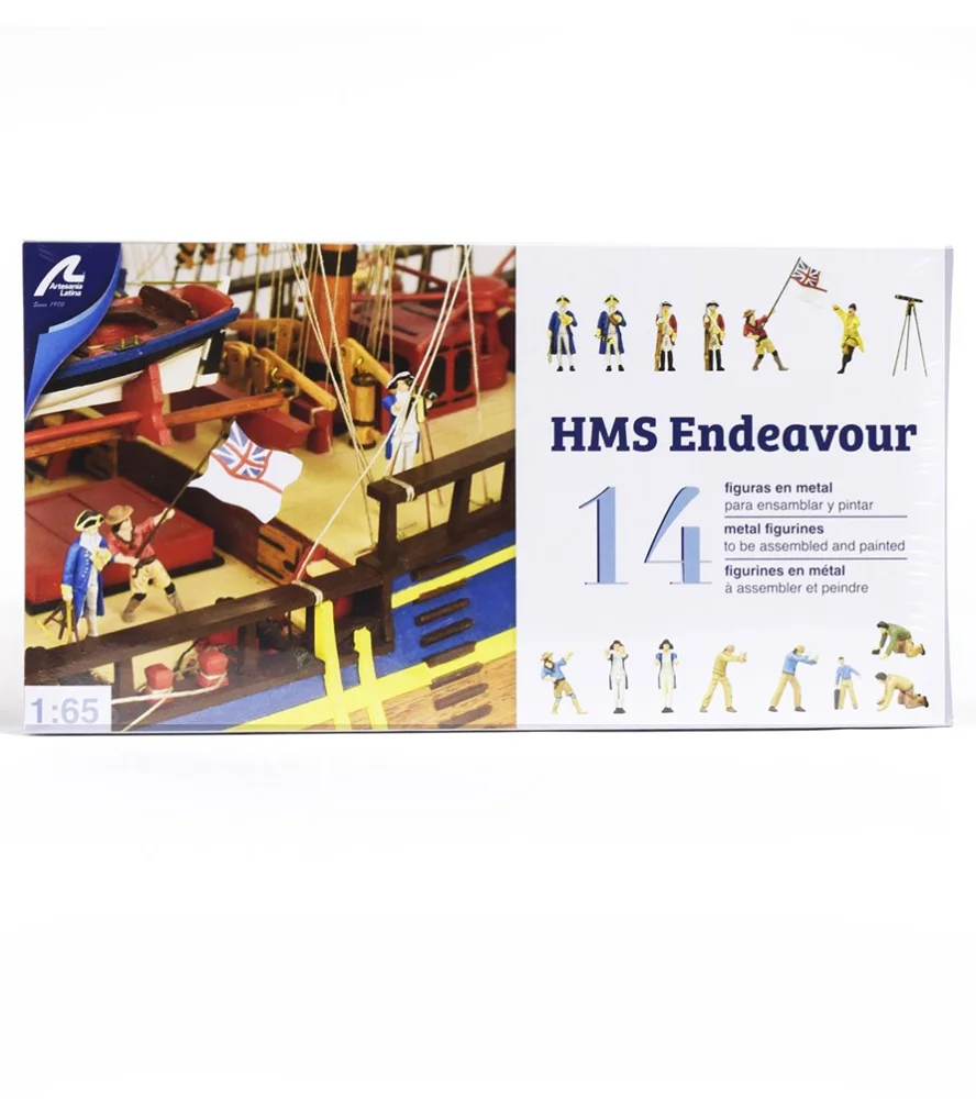 Pour donner encore plus de réalisme à la maquette en bois du navire britannique HMS Endeavour, ne manquez pas l'ensemble de 14 figurines avec accessoires en métal à l'échelle 1/65 des membres de l' équipage, prêt à être assemblé et peint. Dimensions des figurines : de 25 à 30 mm. Le set de figurines comprend les personnages suivants :