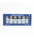 Ensemble de peintures acryliques à l'eau pour modèle bateau cotre Pen Duick se compose de 6 flacons de peintures différentes, chacune contenant 20 ml de produit. En ce sens, il comprend les couleurs suivantes dans les peintures : blanc coque, gris noir, ombre brûlée, rouge vif, vert Pen Duick et or.