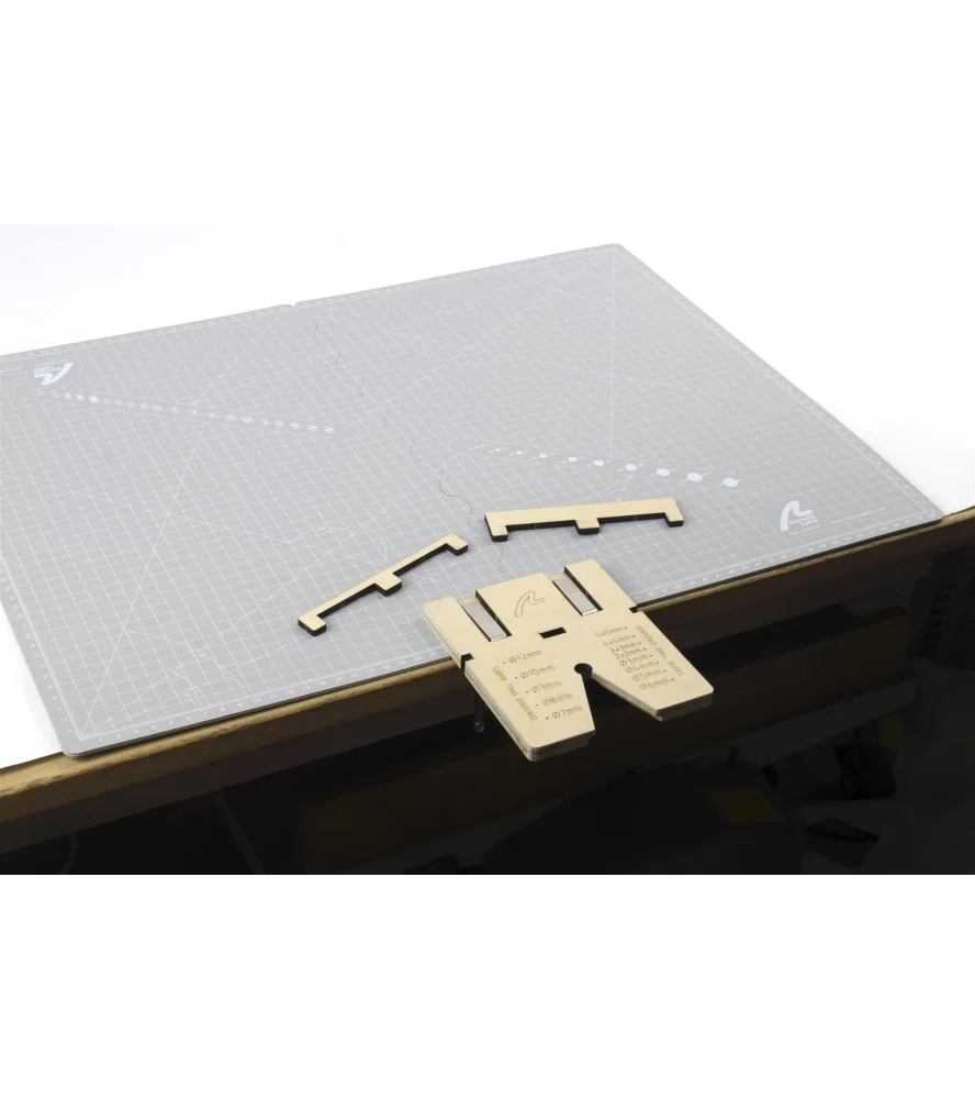 Inoltre, questo supporto di lavoro multifunzionale è dotato di guide di supporto per il taglio e di guide di centraggio per la foratura di aste e strisce di diverse dimensioni. A causa dei possibili danni al tavolo, si consiglia di proteggerlo con un tappetino da taglio -e di fissare il supporto sopra di esso prima di procedere con queste fasi dell'assemblaggio del modello o dell'artigianato.