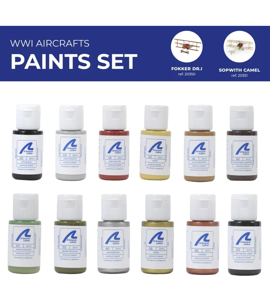 Het verfpakket voor modelvliegtuigen uit de Eerste Wereldoorlog kan worden gebruikt voor het schilderen van de 1/16e schaalmodellen van de Fokker Dr. I y Sopwith Kameel van Artesania Latina. Ze zijn perfect geschikt voor gebruik met airbrushhoewel ze ook gebruikt kunnen worden met een penseel.