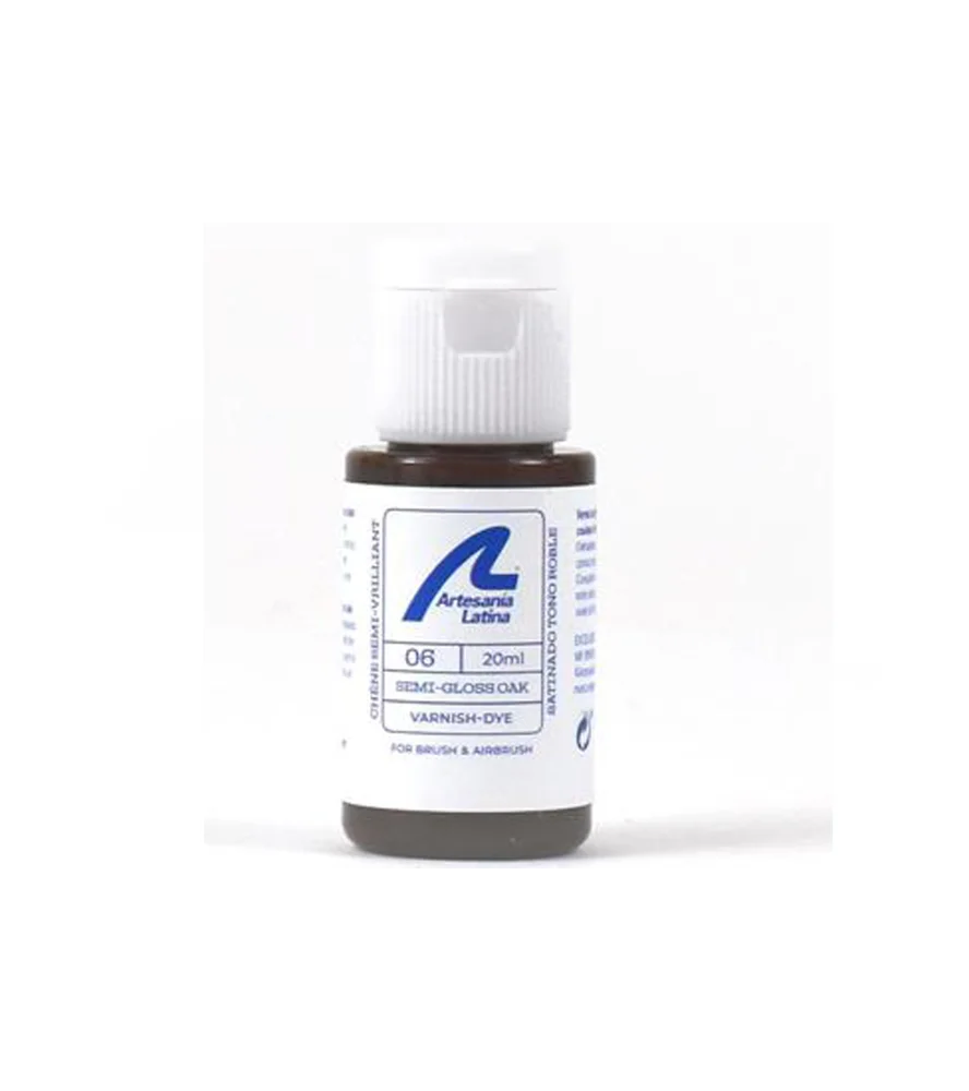 Vernis - satijnen beits op waterbasis in eikentint in flesje van 20 ml. Geurloos, gemakkelijk aan te brengen met borstel en airbrush en uitzonderlijke afwerking. Uitstekende weerstand en duurzaamheid.