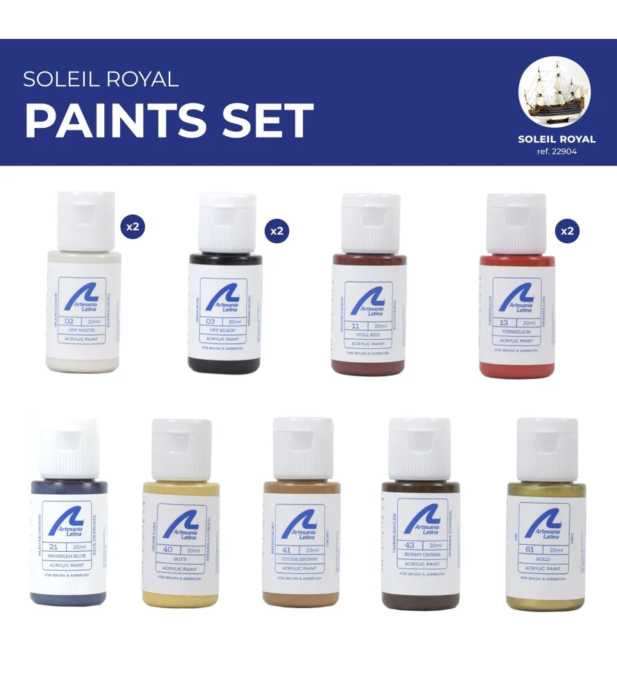 Het pakket watergedragen verven voor het modelschip Soleil Royal bestaat uit 12 verschillende verfpotjes met elk 20 ml product. Het bevat de volgende verfkleuren: gebroken wit (x2), gebroken zwart (x2), romprood, Pruisisch blauw (x2), kaki geel, cacao, taankleur, goud en vermiljoen.