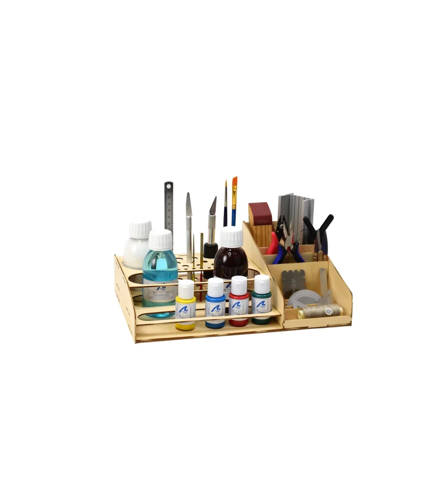 Onmisbaar voor de modelbouw... We hebben de Modeler's Paint and Tool Organiser opnieuw ontworpen op basis van de suggesties en ervaringen van onze modelbouwvrienden. Het is een onmisbaar element als je wilt dat het in elkaar zetten van een model je geen hoofdpijn bezorgt. Gemaakt van hout, in voorgesneden karton met eenvoudige montagelaser, zal het je werk enorm vergemakkelijken. Het is ook de perfecte aanvulling voor de Modelbouwwerkplaats (27648).