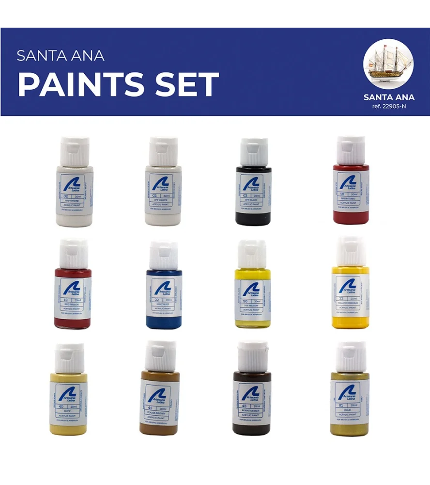 Het verfpakket voor het Santa Ana modelschip van de lijn kan worden gebruikt voor het schilderen van het Artesanía Latina Santa Ana schaalmodel. Ze zijn perfect geschikt voor gebruik met airbrushhoewel ze ook kunnen worden gebruikt met een penseel.