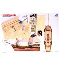 Deze heruitgave van de marine modelbouw kit met het HMS Supply model bevat onderdelen van hoge kwaliteit. 6 zeer nauwkeurige lasergesneden houten platen, 2 messing foto-geëtste platen met talrijke details - waarvan één kleiner -, een set berkenhouten onderdelen - platen, latten en ronde stangen -, eiken fineer, een fantastische set van 11 genaaide katoenen zeilen die klaar zijn om te worden ingesteld, katoenen draden voor manoeuvreren in verschillende kleuren en diktes en vlaggen.