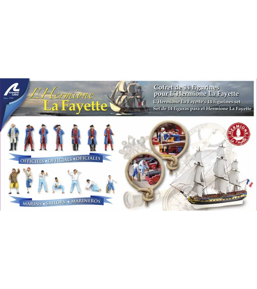Zestaw 14 metalowych figurek w skali 1/89 do złożenia i pomalowania modelu okrętu Hermione La Fayette Frigate (22517-N). Wymiary figurek: od 0,787'' (20 mm) do 0,984'' (25 mm). Zestaw figurek zawiera następujące postacie i zakresy: