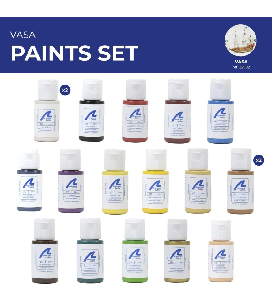 Zestaw farb wodnych do modelu szwedzkiego okrętu wojennego Vasa składa się z 16 różnych pojemników z farbą, z których każdy zawiera 20 ml produktu. Obejmuje on następujące kolory farb: złamana biel, złamana czerń, jasna czerwień, czerwień kadłuba, błękit królewski, błękit pruski, żółcień lodowa, głęboka żółć, żółcień khaki, kakao, odcień opalenizny, zieleń kadłuba, złoto, jasna zieleń, fiolet i baza cielista.