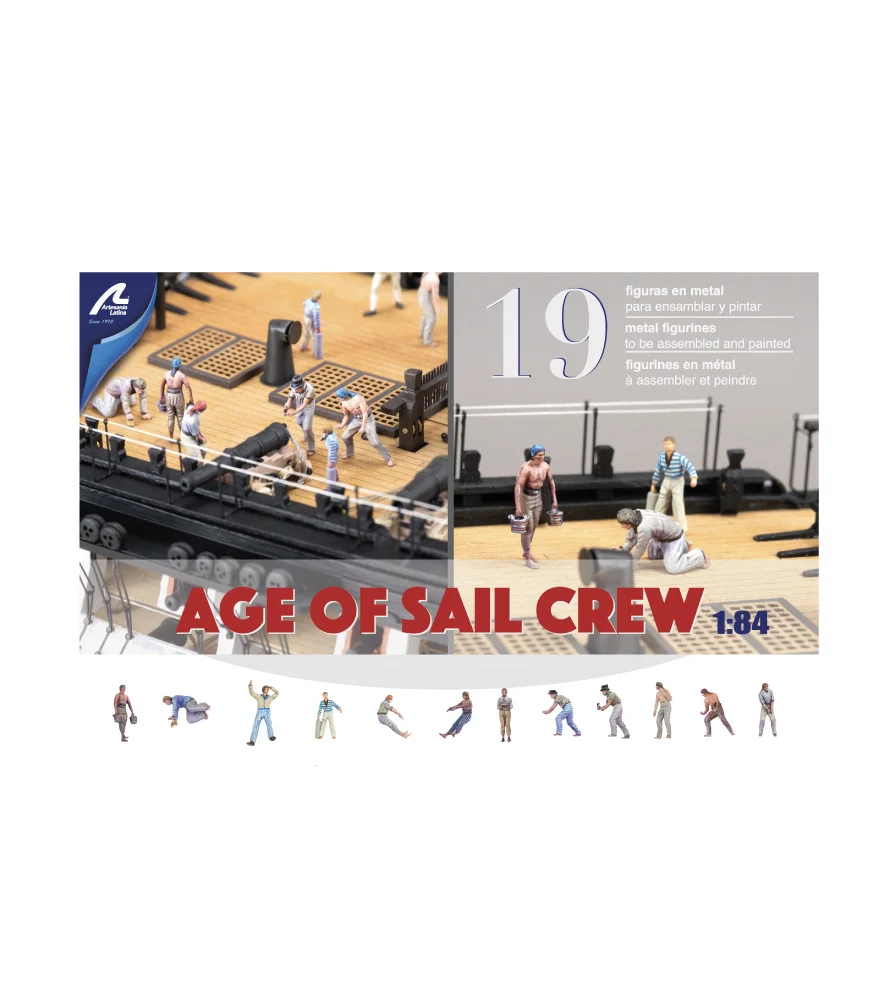 Aby nadać jeszcze więcej realizmu drewnianym modelom statków, takich jak HMS Victory - i wielu innych, takich jak Cutty Sark, St. John of Nepomuk, St. Anne i Holy Trinity - nie przegap zestawu 19 metalowych figurek marynarzy w skali 1/84 (1700-1815) - A Age of Sail Crew - gotowych do złożenia i pomalowania. Wymiary figurek: około 20 mm. Zestaw figurek zawiera następujące postacie: