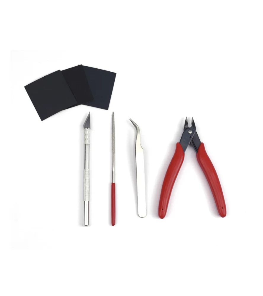 Podstawowy zestaw narzędzi do modelowania plastiku. Zestaw narzędzi do modelowania plastiku Nº2 zawiera narzędzia potrzebne do łatwiejszego budowania modeli statków, samolotów, pociągów, samochodów i motocykli: zawiera przecinak do pudełek, płaskie noże , zakrzywioną pęsetę , płaski pilnik i trzy kawałki papieru ściernego.