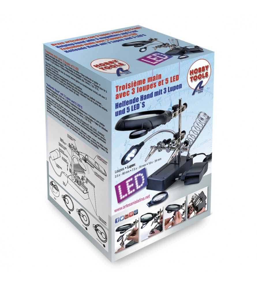 Braço articulado com 3 lupas e 5 luzes LED. Também chamado robô ou terceira mão, é uma ferramenta polivalente para modelagem, eletrónica, joalharia, costura e trabalhos manuais. É composto por um braço articulado com cinco potentes luzes LED, uma lupa grande (diâmetro de 90 mm e ampliação de 2,5x), duas lupas pequenas (diâmetro de 34 mm; ampliação de 7,5x e 10x), dois clipes de crocodilo e um suporte para ferro de soldar, tudo apoiado numa base reforçada e estável. Indispensável para uma fixação perfeita e uma visualização óptima das peças, tanto no fabrico de modelos de precisão como na criação ou manipulação de outros objectos de artesanato.