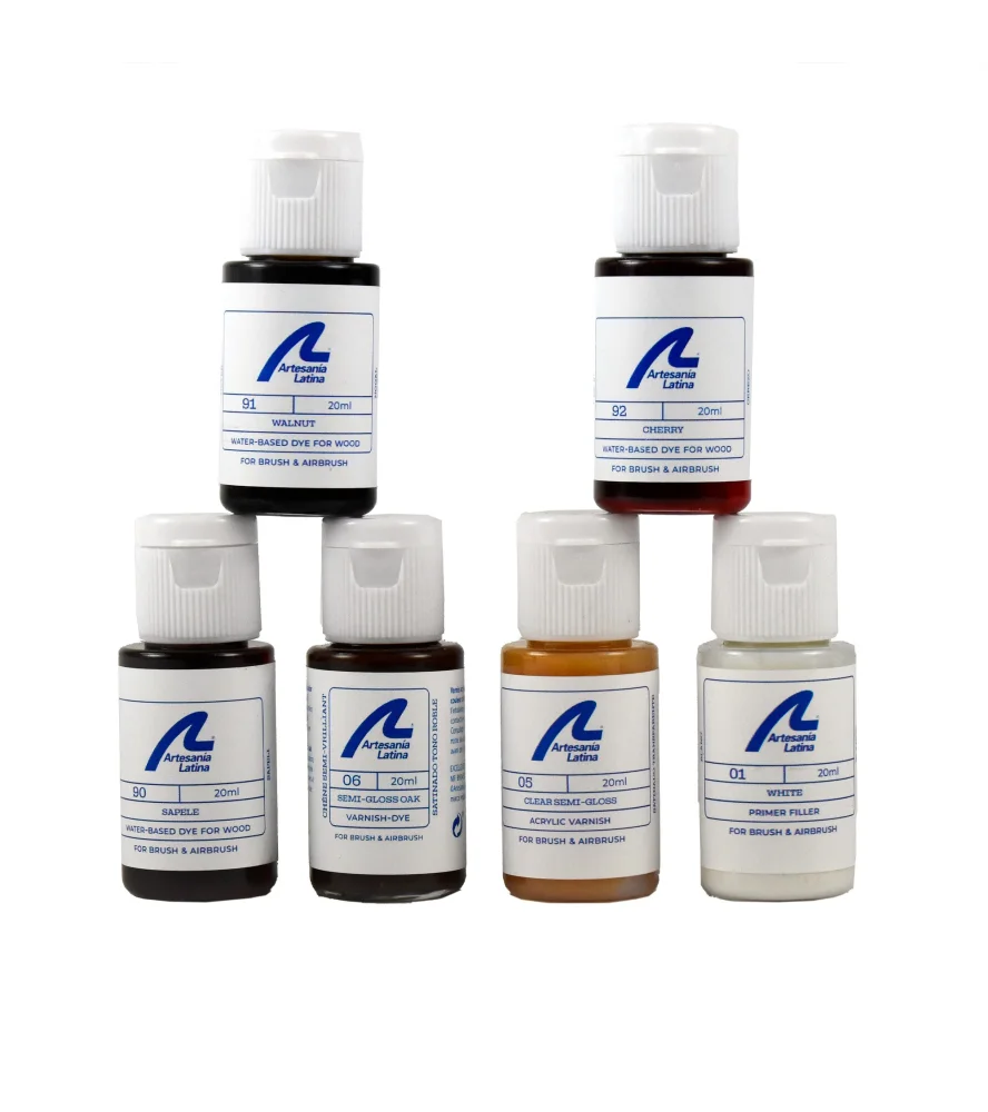 Os produtos de acabamento da Artesanía Latina são os mais utilizados pelos modelistas experientes, uma vez que são os mais adequados para a aplicação com aerógrafo. A embalagem de tinta e verniz com cores de madeira dura para todos os tipos de modelos de madeira é indispensável na oficina do modelista!