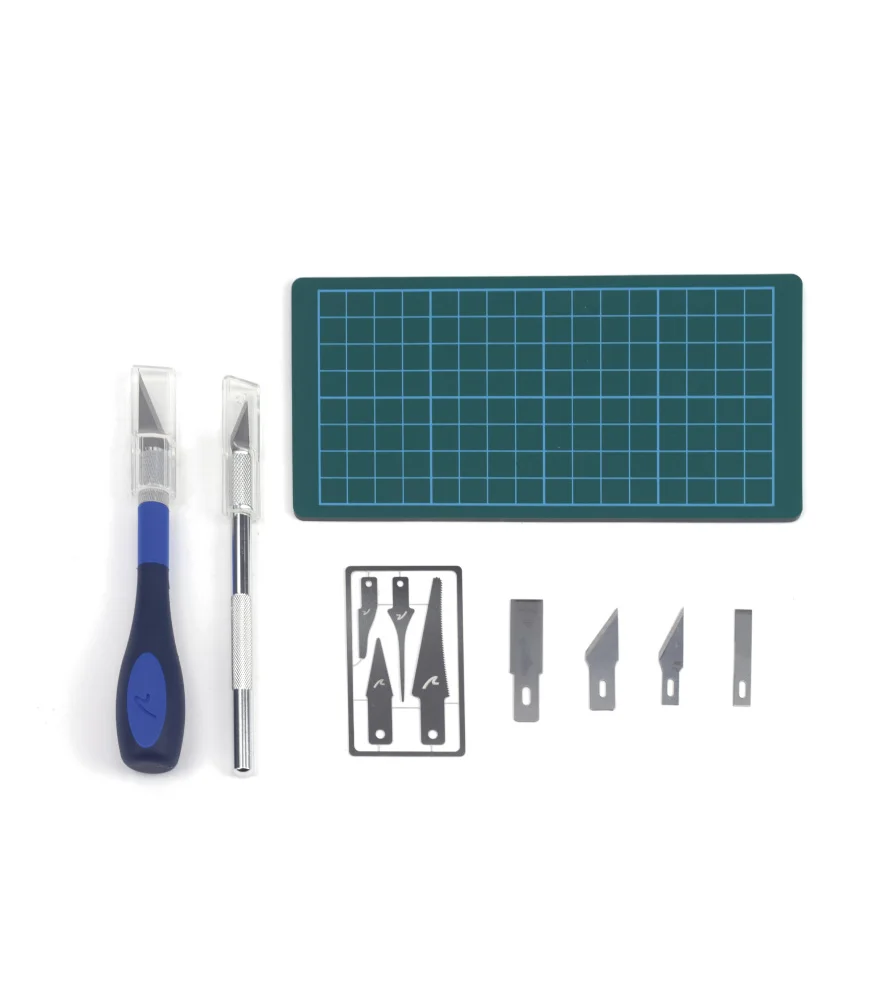 Для моделистов, которым требуются точные разрезы на деталях моделей. С помощью профессионального набора инструментов для резки моделей вы сможете легче создавать миниатюрные копии и применять новые техники моделирования. В набор входят универсальный резак № 5 с эргономичной ручкой и резак № 1 типа скальпель, а также 2 лезвия из нержавеющей стали и 2 пилки для резака № 5 и 2 лезвия, пилка и аппликатор для клея для резака № 1. Также имеется коврик для резки 180 x 90 мм.