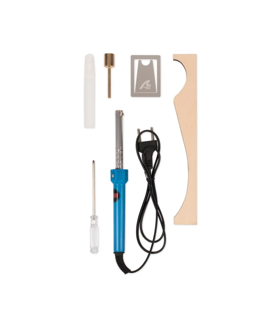 Гибочный инструмент - это незаменимый электрический инструмент для успешной гибки любых реек до 3 мм. В набор входят следующие элементы: электрический паяльник; латунный наконечник для сгибания древесины; металлическая подставка, чтобы паяльник не прожег рабочую поверхность; отвертка для затягивания наконечника в устройство; деревянный шаблон с составными изгибами; и, в качестве подарка или бонуса, флакон белого клея для моделистов.